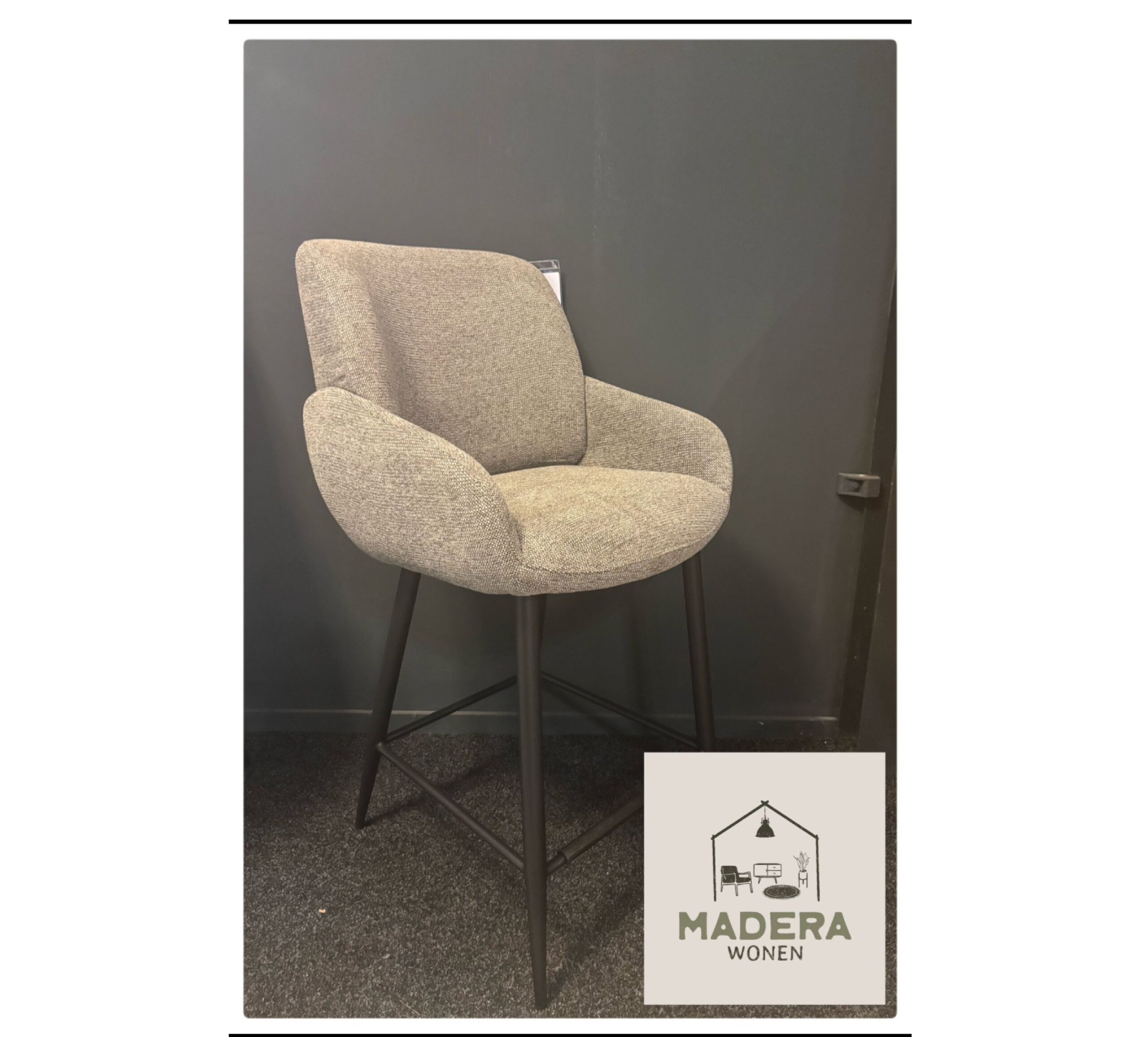 Deze barstoel is bekleed met een geweven stof. Een fijne zit met armleuning.
