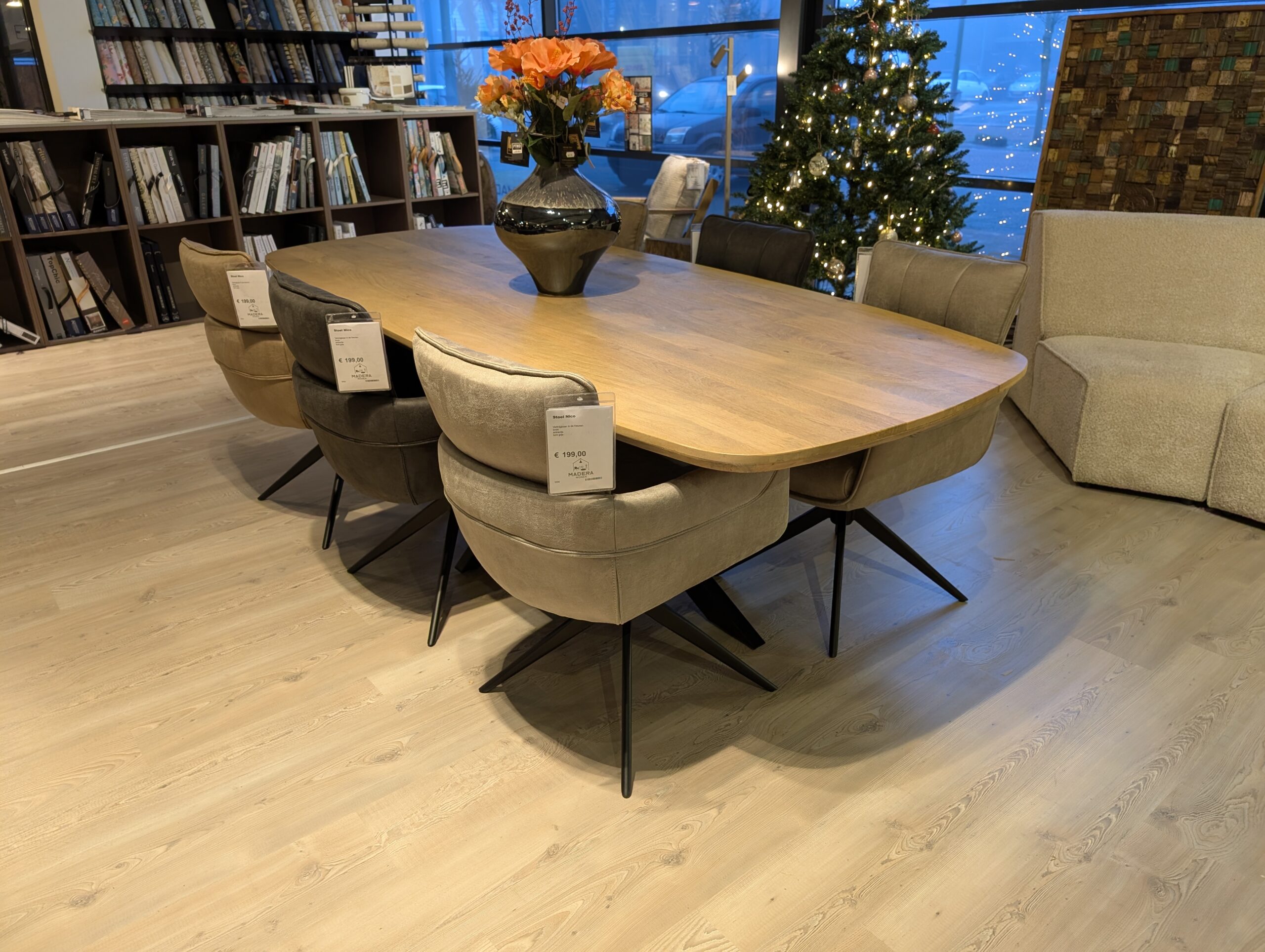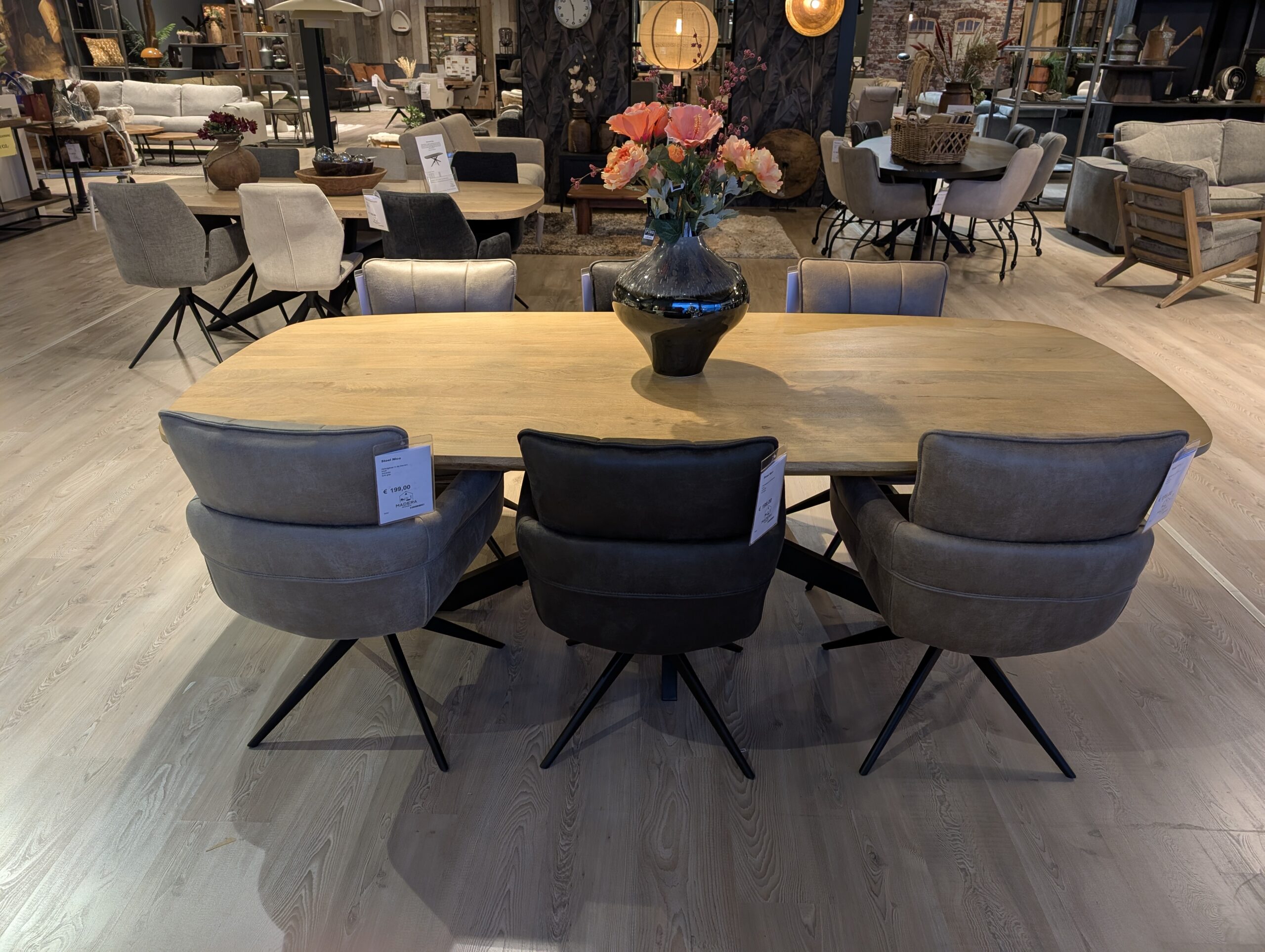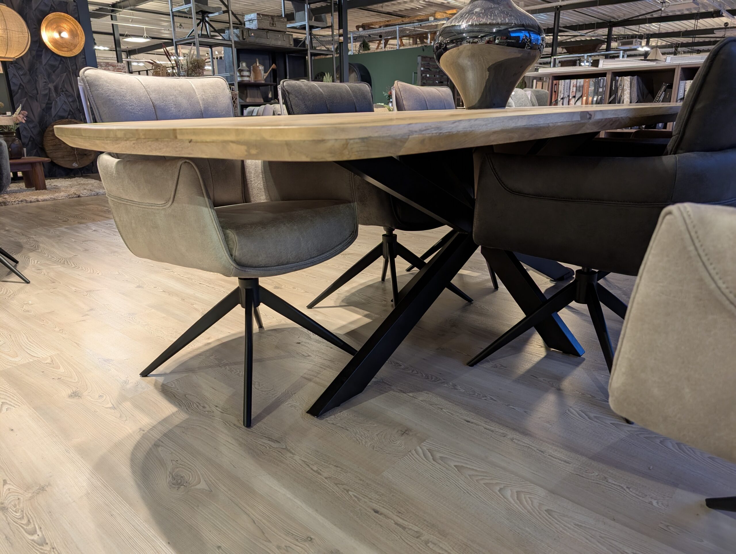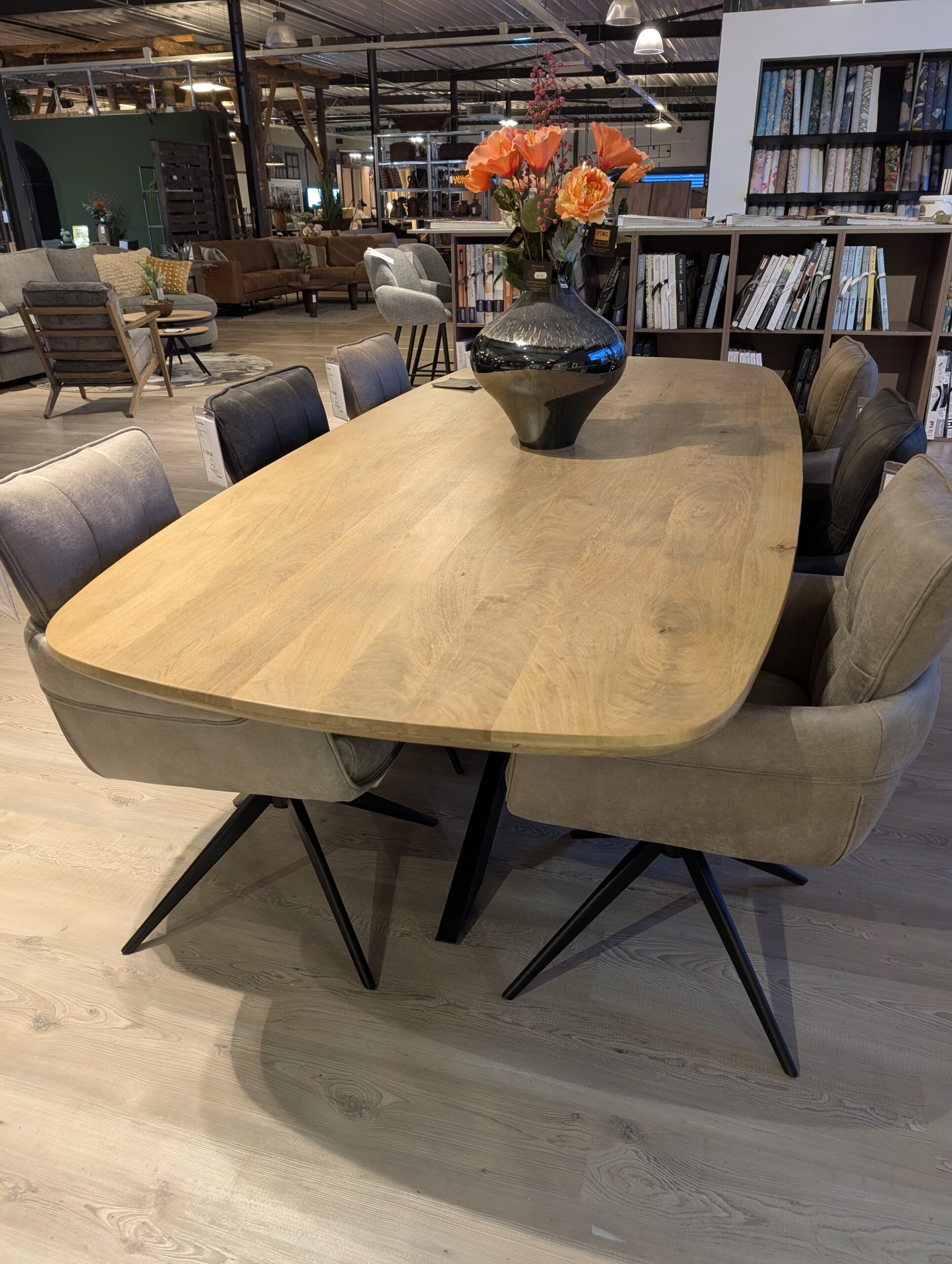 Eettafel Ben is een prachtige eettafel vervaardigd uit mangohout. Deze heeft een mooi lichte gladde afwerking. In de vorm deens ovaal met een verjongd tafelblad. Met in het midden een zwart stalen matrixpoot.