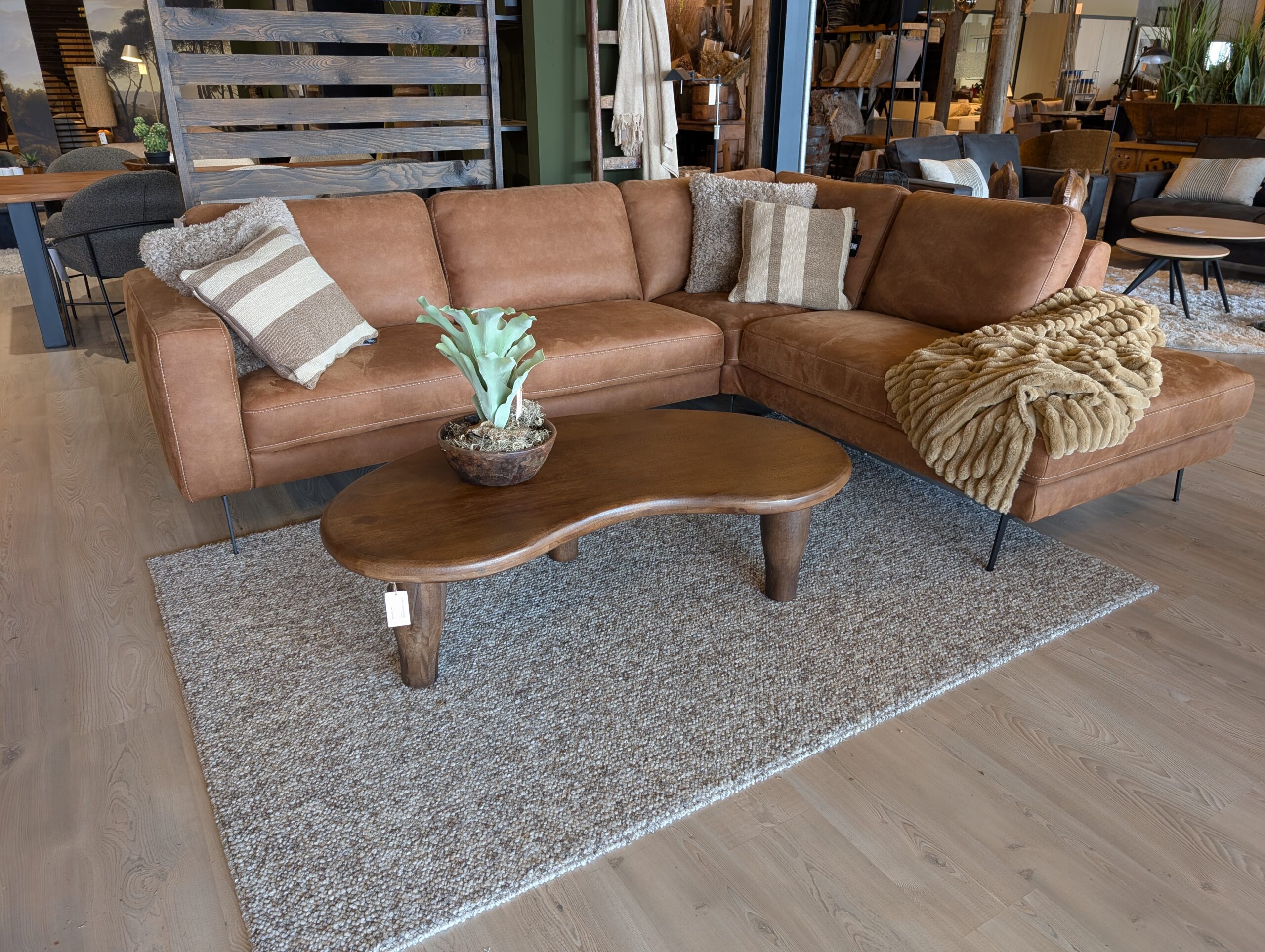 Deze hoekbank Living heeft vaste kussens en is bekleed met bull leer in de kleur Camel. Dit is een stof die bestaat grotendeels uit rundleer en de top laag is een zachte microvezel stof.