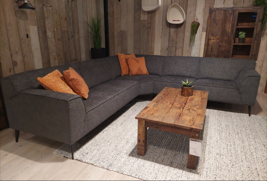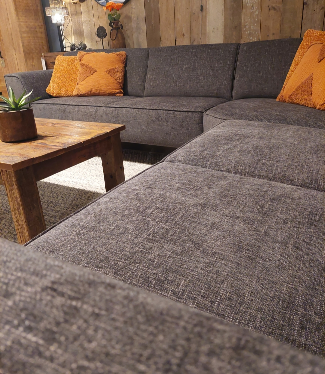 Deze bank kunt u in verschillende opstellingen laten maken. In onze showroom hebben we van dit model ook een rechte bank staan in een andere stof. Deze staat ook op onze website.