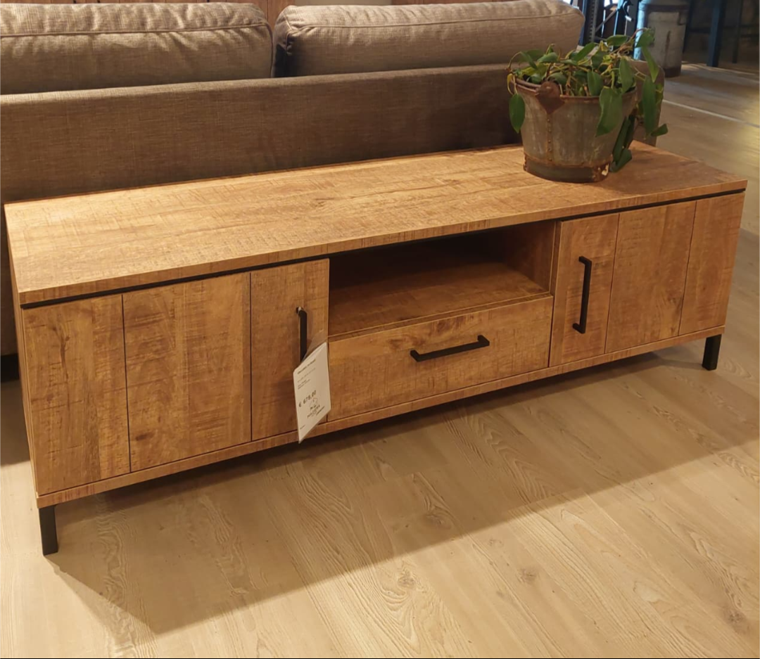 Deze tv kast is mooi belijnd, strak, heeft een warme uitstraling met de mangoprint die er op is gezet. Het is een meubel dat jaren mee gaat en mooi blijft. Het is namelijk gemaakt van Lamulux.